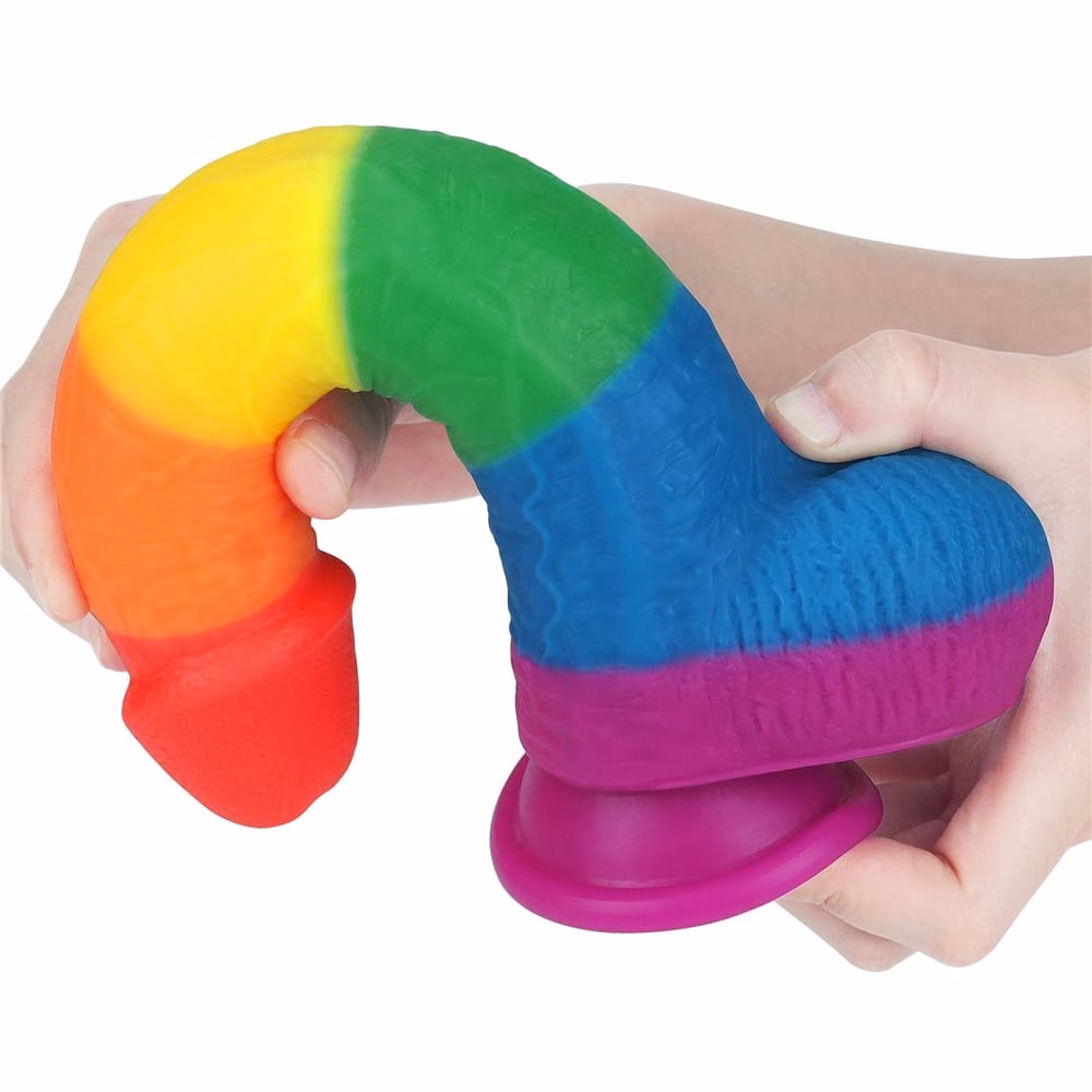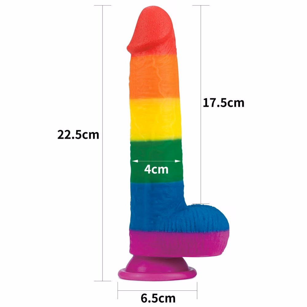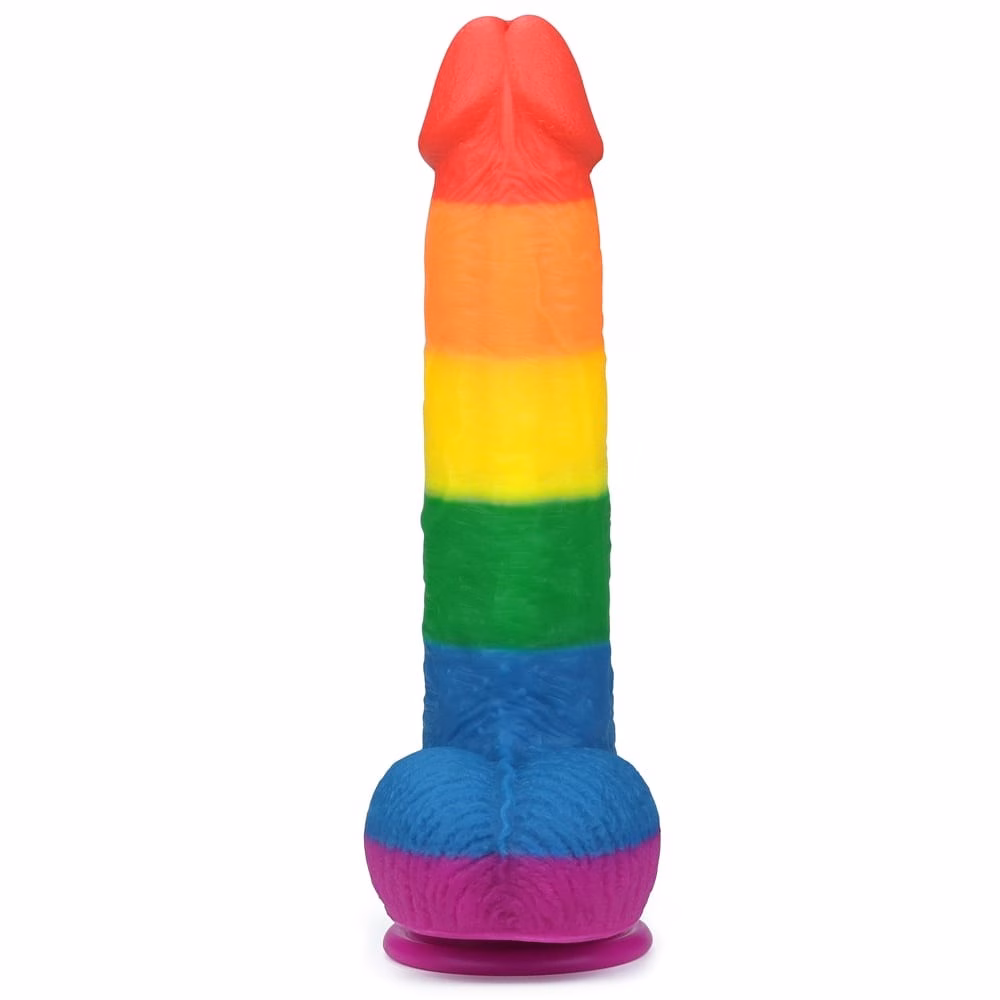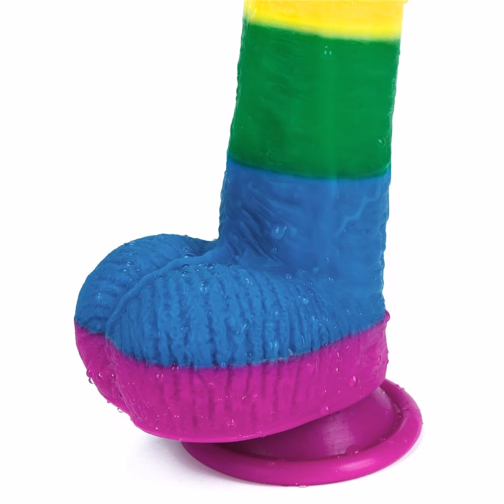 Szivárvány színű, pénisz formájú, kiváló minőségű szilikonból készített, erezett felületű, herékkel kiegészített, flexibilis, motor nélküli dildó. Tapadókorongja segítségével sík felületen rögzíthető.
