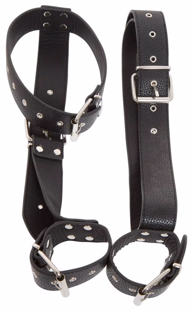 Kiváló minőségű műbőrből készülő kötöző, melyekkel a kezeket a hát közepéhez lehet rögzíteni. A nyak-, a derék- és a hátpánt mérete állítható.