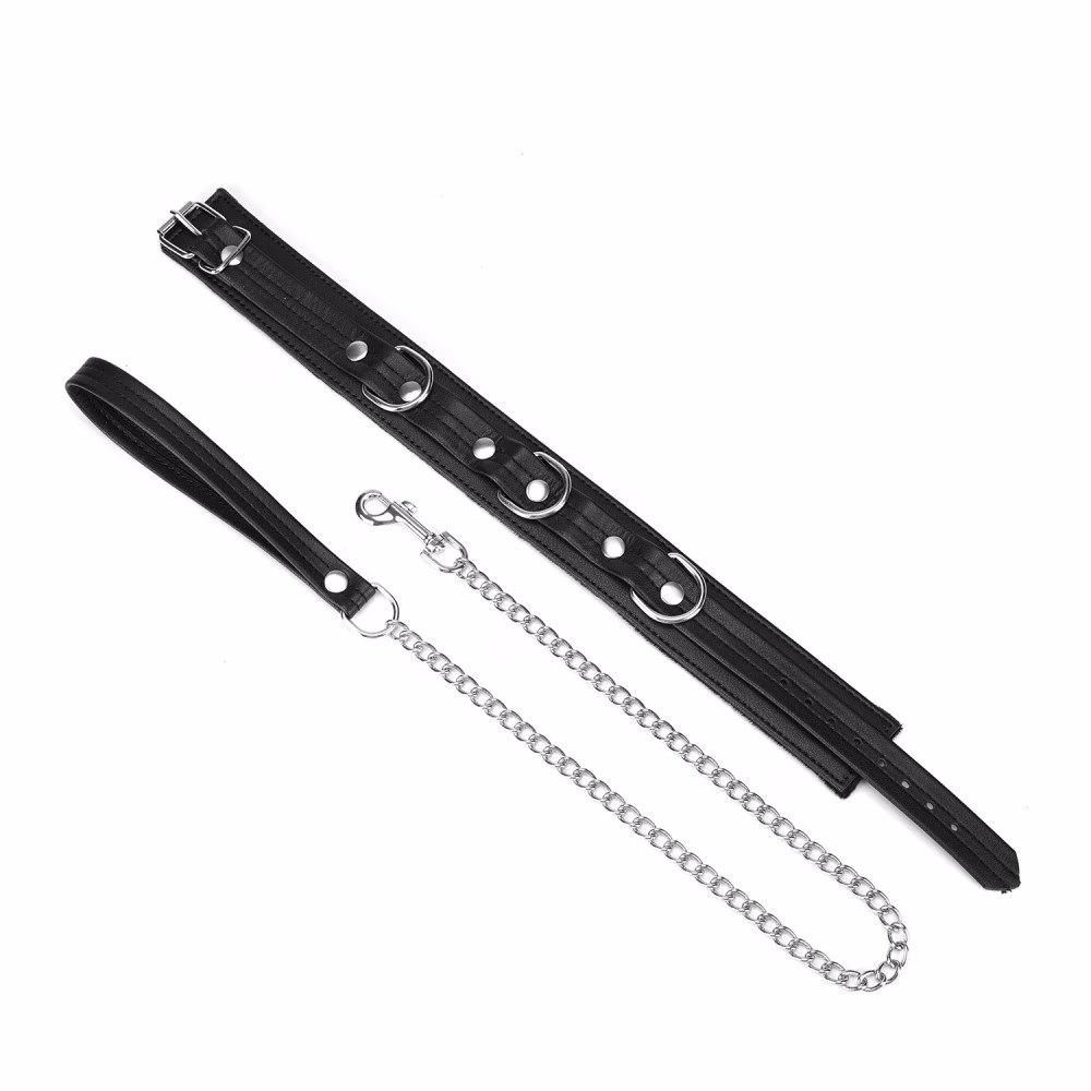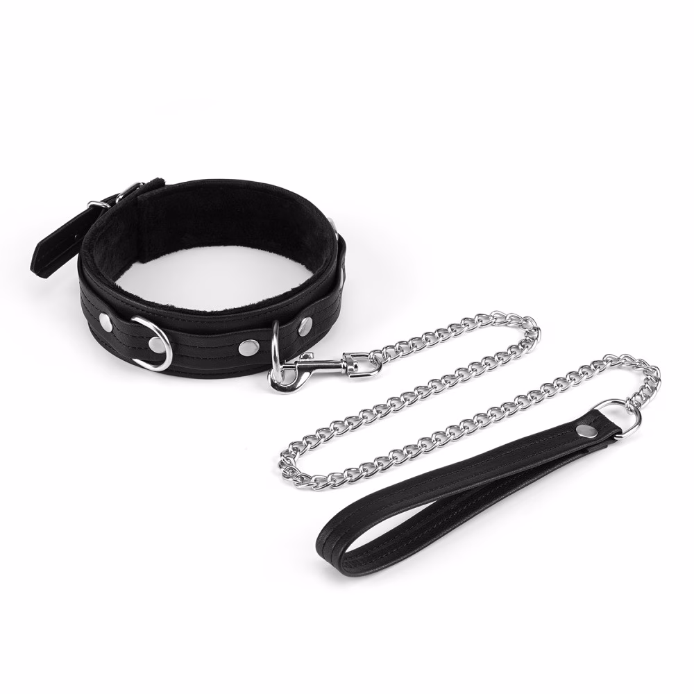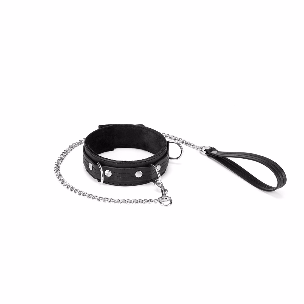 készült ez a bondage nyakörv és a hozzá illő póráz. A klasszikus fekete és ezüst színvilággal