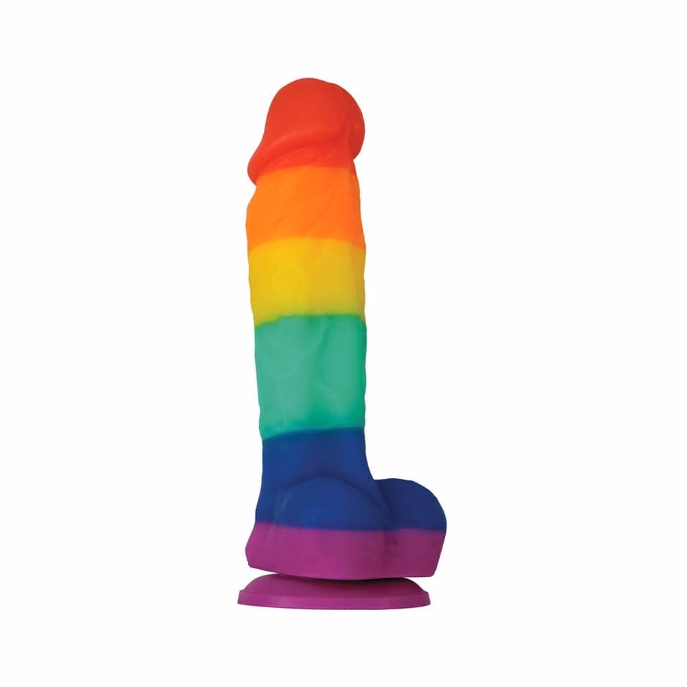 Szivárvány színű, pénisz formájú, kiváló minőségű szilikonból készített, erezett felületű, herékkel kiegészített, motor nélküli dildó. Tapadókorongja segítségével sík felületen rögzíthető.