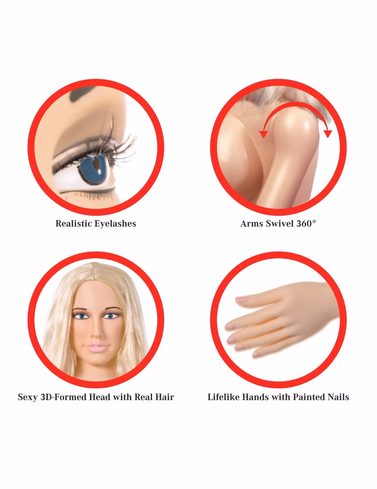 Női szerelembaba, mely intim együttlétek, legénybúcsúk kiegészítője lehet. Magassága, testmérete átlagos, arca 3D-s. Ágyéki részén lévő csőszerű testnyílásai kiegészíthetőek a termék részét képező realisztikus, 100% orvosi szilikonból készült vaginával és ánusszal.