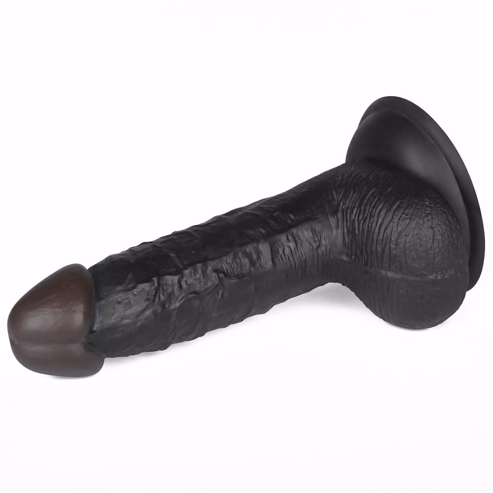 kialakítású, puha, rugalmas, erezett felületű, herékkel kiegészített dildó,