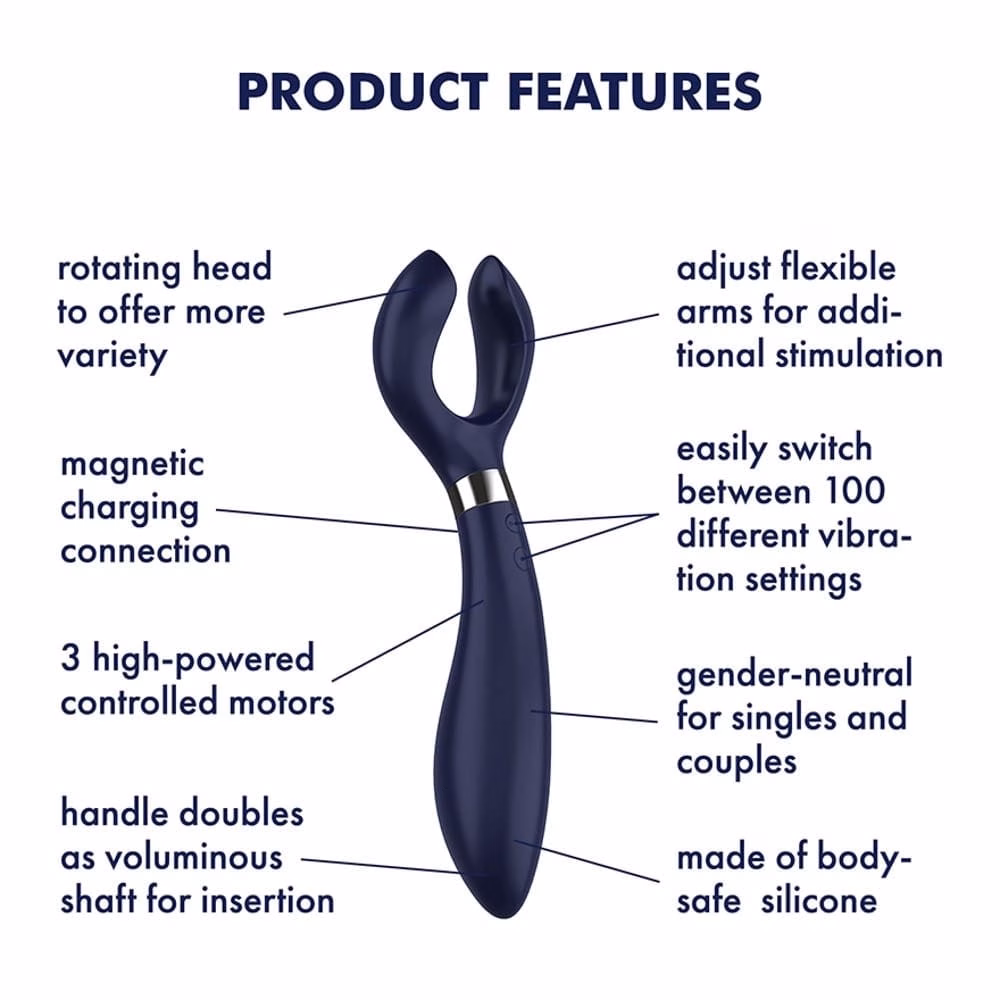 Bőrbarát, kiváló minőségű anyagból készített, pároknak is ajánlott multifunkciós eszköz, 3 beépített motorral.(1-1 motor a szárakban és 1 motor a törzsben) . Mind a három motor 10 rezgési funkcióval rendelkezik, a törzsben elhelyezett motor külön is vezérelhető. A fejrész 180 fokkal elforgatható. Multifunkciója abból adódik, hogy akár csiklóizgatóként, akár péniszgyűrűként, akár mellbimbó izgatására. A dobozban lévő használati útmutató 32 lehetséges felhasználási módot sorol fel.