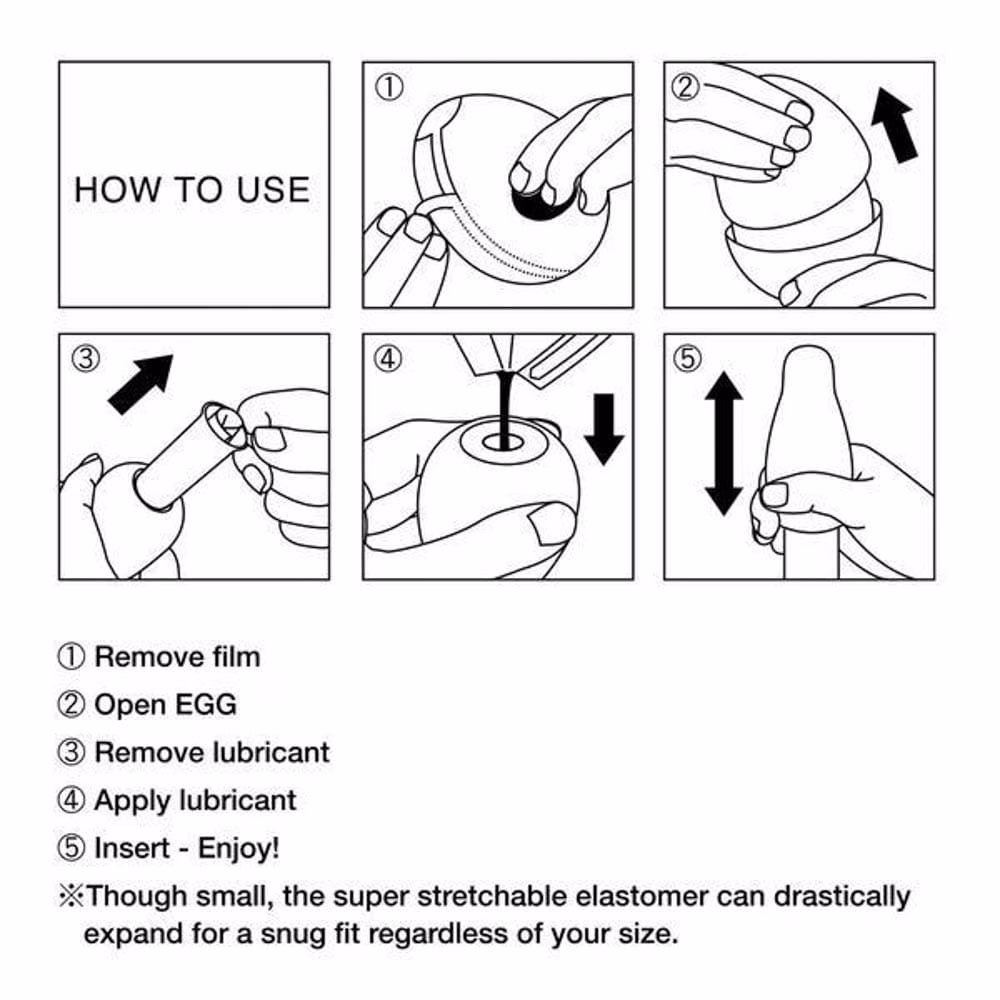 Használata : a védőfólia eltávolítása után a szétnyitott tojásból vegye ki a maszturbátort és a csomagban található síkosítót annak belsejébe kell csorgatni és ráhúzni a péniszre.