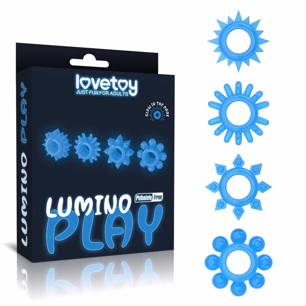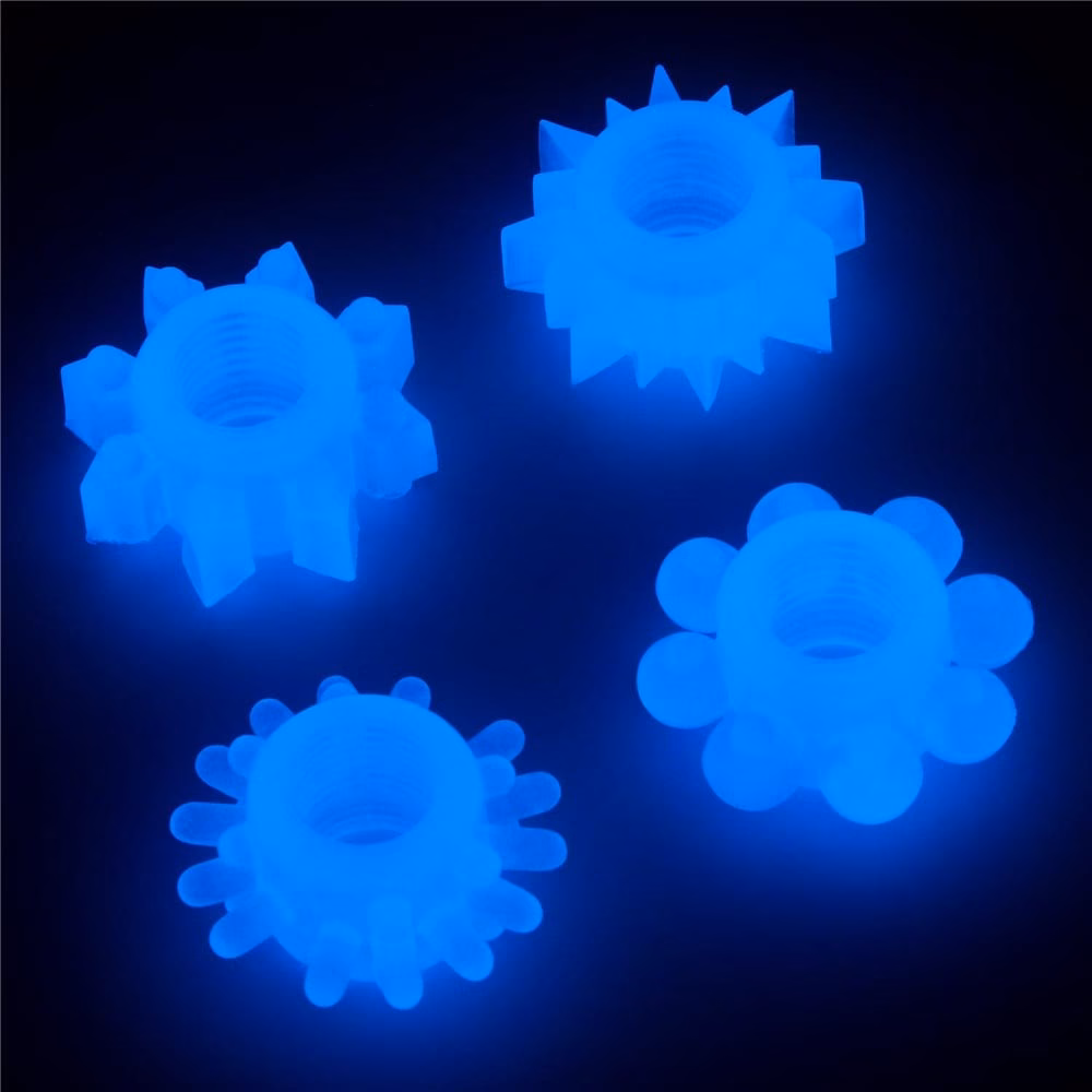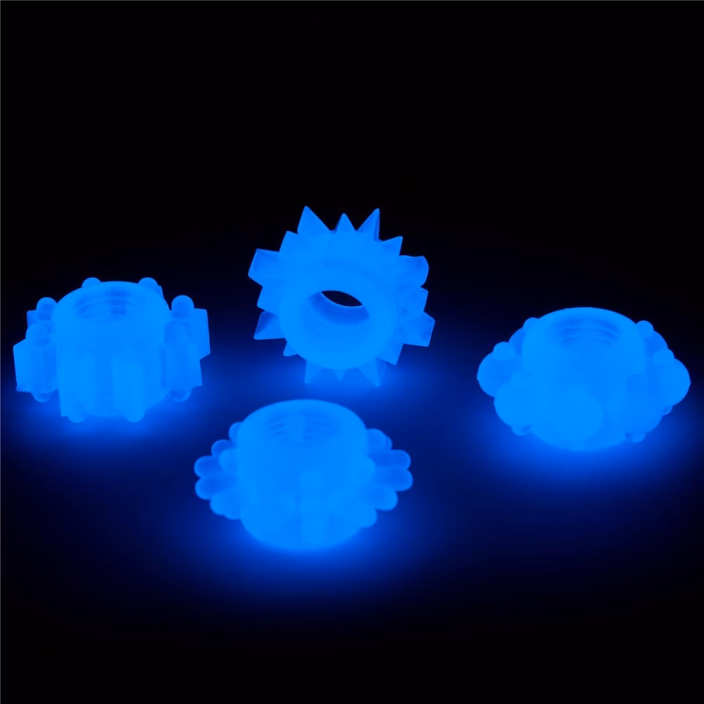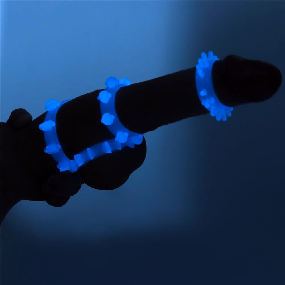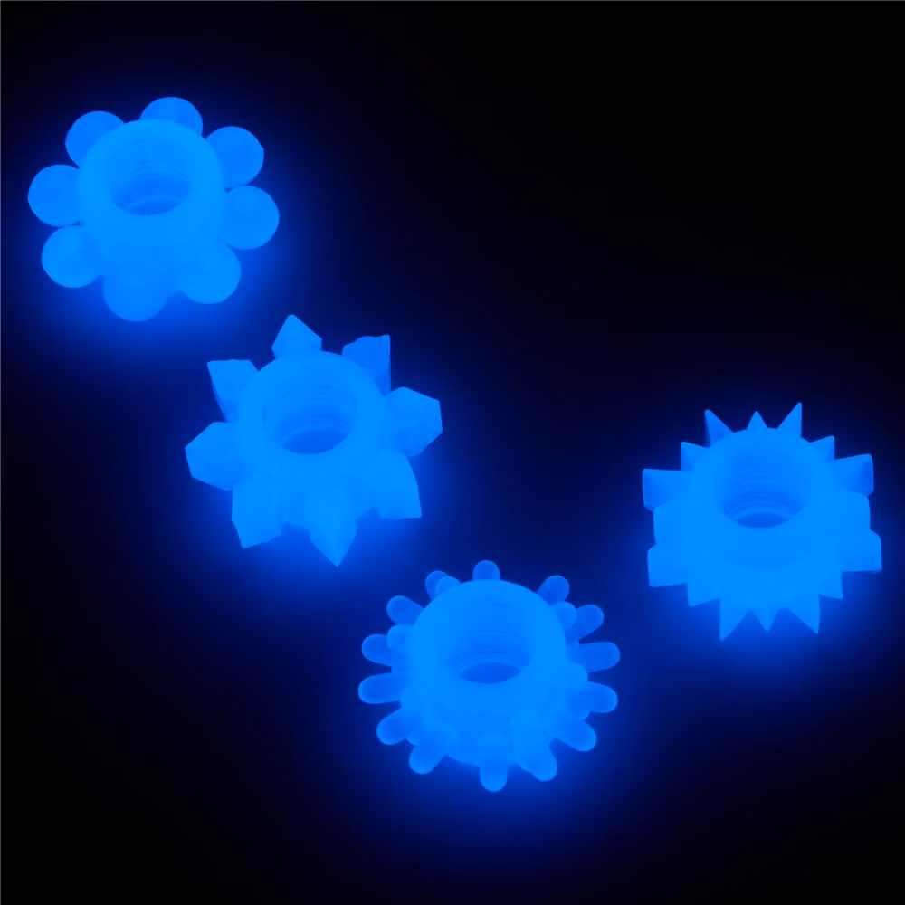 Férfiaknak ajánlott, péniszre helyezhető, 4 darabból álló, sötétben kék színben világító erotikus készlet, mely elősegíti merevedés fenntartását viselője számára. Kialakítása révén behatolás közben a hüvely izom idegvégződéseinek stimulálására is tökéletesen alkalmas. A gyűrűk külső és belső átmérője is azonos. Ajánlott napközben fénynek kitenni a legjobb hatás érdekében.