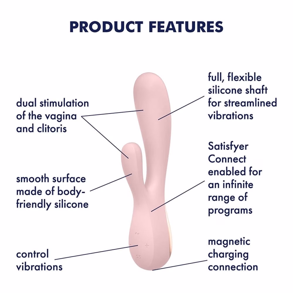 Okostelefonról irányítható, ergonómiailag kialakított, két motorral felszerelt vibrátor a díjnyertes Satisfyer Connect alkalmazással, mely a csikló és a g-pont együttes stimulálására is használható. Az applikáció segítségével egyedi rezgési funkciókat lehet alkotni, akár zenei ritmusból (pl. Spotify), saját vagy párunk hangjából vagy környezeti zajokból is, amelyeket meg is lehet osztani másokkal. Biztonságos video chat kapcsolatot is kezdeményezhet, így akár partnere is irányíthatja az eszközt, miközben láthatják is egymást. A kezelőgombok segítségével természetesen applikáció nélkül is használható.