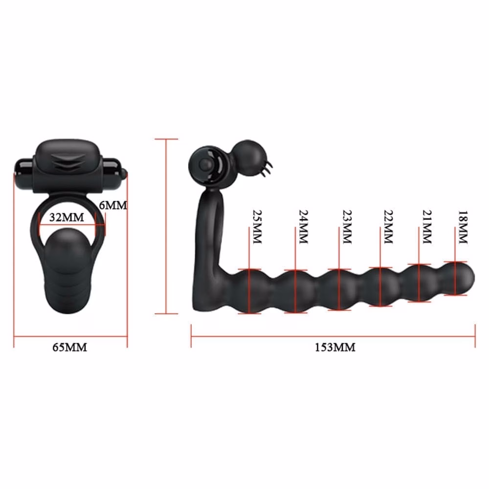 Sima felületű, kiváló minőségű anyagból készített, 10 rezgési funkcióval rendelkező péniszre helyezhető gyűrű, mely elősegíti a merevedés fenntartását viselője számára. 6 eltérő átmérőjű golyóból álló anális stimulátorral van kiegészítve, biztosítva ezzel a kettős behatolást.