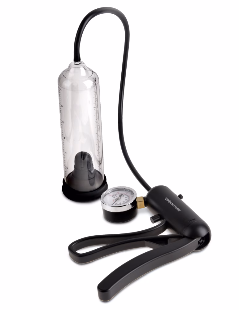 Férfiaknak ajánlott, hímvesszőre helyezendő henger alakú készülék, mely a hozzá kapcsolt pumpával fokozza annak vérbőségét. Egyszerűen helyezze be a péniszét a vákuumhenger csövébe, nyomja össze az EZ-markolat fogantyúját, és nézze meg, hogy az fokozatosan növekszik.A puha PVC hüvely tökéletesen szoros tömítést képez a bőrrel szemben, és erős vákuumot hoz létre a kamrában, ami erekciót eredményez. Az átlátszó vákuumhenger láthatóvá teszi az etredméynt, míg a könnyen leolvasható mérőeszközzel megtudhatja, hogy mekkora nyomást pumpált.Ha elérte a kívánt méretet, egyszerűen nyomja meg a gyorskioldó pisztolyt a fogantyú tetején, hogy azonnal enyhítse a nyomást, és máris készen áll a játékra!Tisztítása : minden használat előtt és minden használat után a hengert langyos szappanos vízzel és segédeszköz tisztítóval kell lemosni.