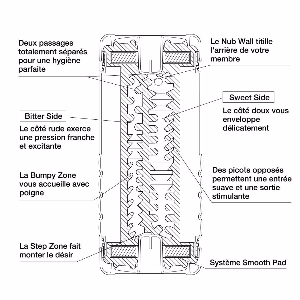 Vízbázisú síkosítóval már ellátott, puha tokkal rendelkező maszturbátor, ennek segítségével a használat kíválóan szabályozható. Különlegessége, hogy a mind a két vége használható, ugyanis eltérő stimuláló hatást biztosító bemeneti nyílásokkal van kialakítva, az egyik szorosabb, a másik lágyabb felépítésű. A terméket egyszeri használatra javasolják, mivel nem tisztítható. Többszöri felhasználás csak óvszerrel ajánlott !