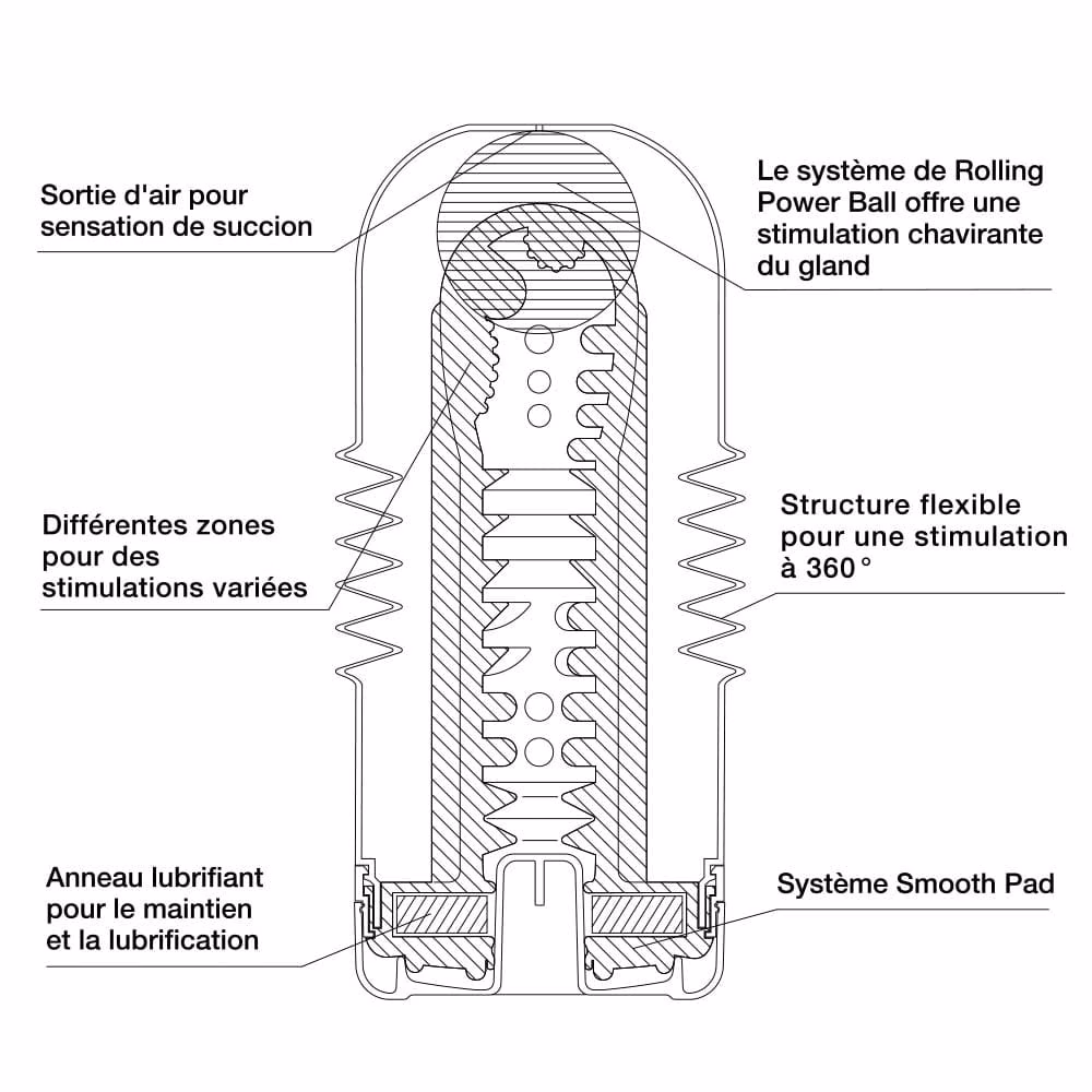 Minőségi anyagok felhasználásával készített, formatervezett, puha, rugalmas anyagból készített, 360°-ban elforgatható, előre síkosított maszturbátor. Különlegessége az úgynevezett Air-Tech szerkezet, amelynek segítségével mozgás közben a betéten kialakított kamrák levegővel telnek meg, majd kiürülnek, így speciális szívó hatást fejtenek ki.